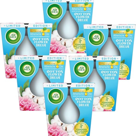 Dodaj do koszykaLPNHK371516391 – Air Wick Świeca zapachowa w szkle – zapach: Cotton Flower Dream – czas palenia do 20 godzin – zawiera naturalne olejki eteryczne – zestaw świec zapachowych 6 x 105 g – C301