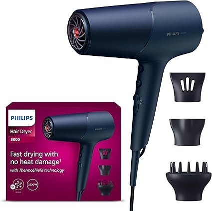 LPNHe057710541 – Suszarka do włosów Philips 5000 Series, Technologia ThermoShield, Funkcja jonizacji, 2.300 W, Metaliczny niebieski, z dyszą do stylizacji 9 mm i 11 mm, dyfuzor objętości, BHD510/20 – K614