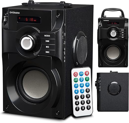 LPNHE877088870 – Overmax Soundbeat to przenośny głośnik Bluetooth z dźwiękiem stereo 15W, radio FM, portem USB, slotem na kartę MicroSD, wejściem AUX Jack 3,5mm, potężnym basem, wyświetlaczem LED, pilotem i baterią do 9 godzin pracy. – B817