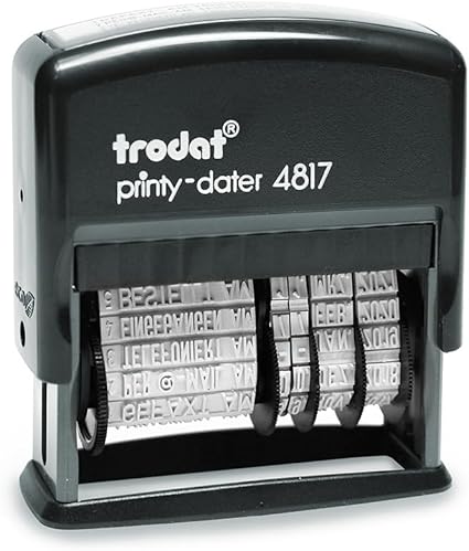 LPNHE901552936 – Trodat Printy 4817 – pieczątka z paskiem tekstowym i datą w kolorze czarnym, 12 tekstów biurowych zmieniających się poprzez obrót, w języku niemieckim, wysokość liter 3,8 mm, odbitka 47×4 mm, poduszka barwy czarnej, samotuszująca – C249