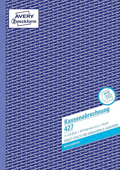LPNHE902477409 – AVERY Zweckform 427 Rozliczenie kasy (A4, 2×50 kartek, 1 kartka papieru niebieskiego, kolumna podatku VAT dla przychodów i wydatków, sprawdzone przez ekspertów prawniczych, przeznaczone dla DE/AT, do właściwego prowadzenia księgowości) – B672
