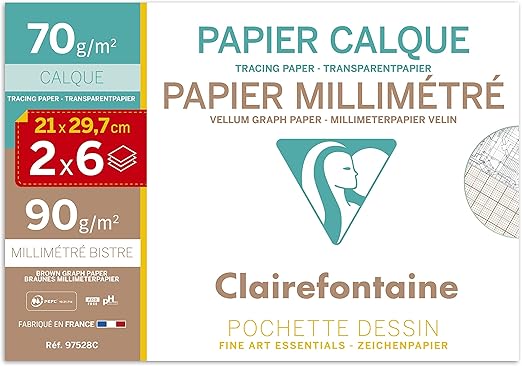 LPNHE904712368 – Clairefontaine 97528C – Teczka do szkicowania szkolnego – 6 arkuszy papieru milimetrowego Vélin – A4 21×29,7 cm 90g i 6 arkuszy papieru kalkowego – A4 21×29,7 cm 70g – Idealna do pracy geometrycznych – B273