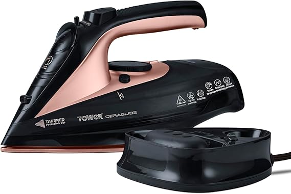 LPNHE906266595 – Wieża T22008RG CeraGlide Żelazko – Żelazko bezprzewodowe – Żelazko parowe z ceramiczną podeszwą i regulowaną funkcją pary, czarno-złote. – E469