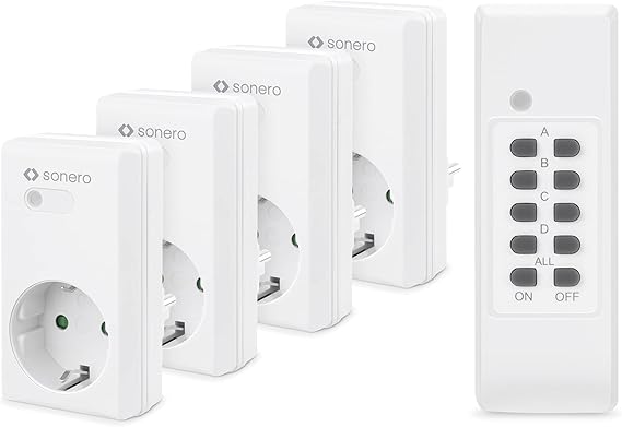 LPNHE914296267 – Sonero zestaw zdalnie sterowanych gniazd: 4 gniazdka radiowe i 1 pilot, 1100 watów, zasięg maksymalny 30m, do użytku wewnątrz, kolor biały. – B105