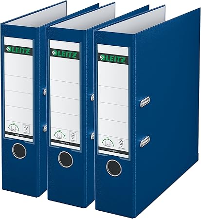 LPNHE915856088 – Leitz Qualitäts-Ordner 180° Plastik, 3er Pack, oryginał, segregator A4 o szerokości 8 cm, wykonany w 90% z recyklingowanego kartonu, 30% z recyklingowanego plastiku, z mechanizmem 180°, pojemność 600 kartek, kolor niebieski, 310335035 – B151