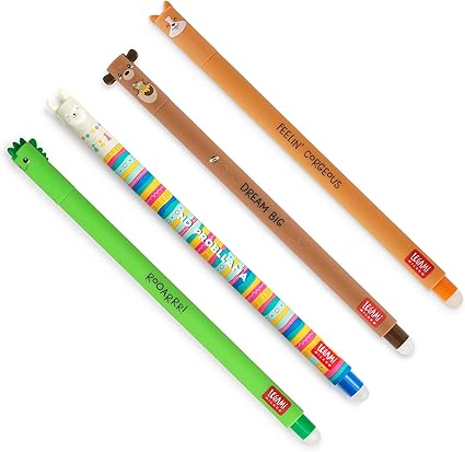 LPNHE916044846 – NAPĘD – Zestaw 4 żelowych gumek do ścierania, Motywy Dinozaur, Miś, Corgi, Llama, Kulka na końcu do usuwania atramentu – Czarny, Niebieski, Zielony, Czerwony, Czuły na temperaturę, Średnica końcówki 0,7 mm – B950