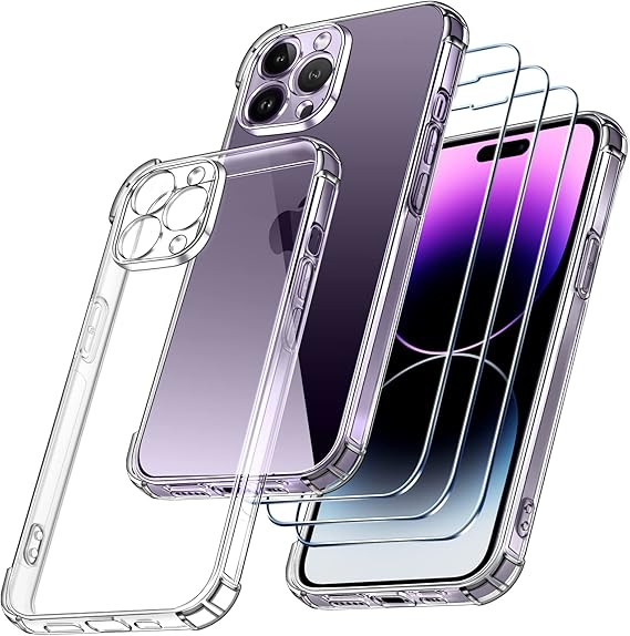 LPNHE919716074 – iVoler 4 w 1 Pokrywa dla iPhone’a 14 PRO 6.1 cala z 3 sztukami szkła hartowanego, transparentna odporna na wstrząsy [Ochrona aparatu fotograficznego] Etui, cienka miękka obudowa ochronna z silikonu TPU – A482