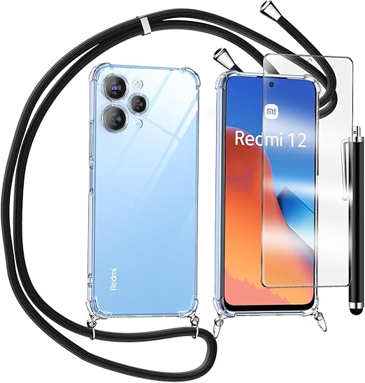 LPNHE921332084 – Pokrowiec TTSWJBD do Xiaomi Redmi 12 z hartowanym szkłem Ochrona ekranu Regulowany pasek na szyję Antywstrząsowy Przezroczysty etui na silikonowy sznurek, czarny – A911