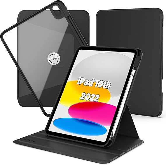 LPNHE922133603 – Etui CACOE pour iPad 10e génération 10,9 pouces 2022 avec porte-stylo, rotation à 360 degrés, étui de protection avec dos transparent et bordure antichoc en TPU, noir – B638