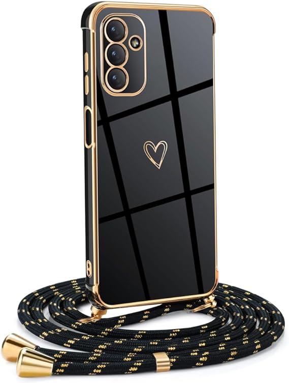 LPNHE925582029 – Pokrowiec na telefon Samsung Galaxy A13 5G/A04S z paskiem na szyję, pokrowiec z motywem serca miłości TPU, etui na telefon z paskiem na szyję do Samsunga A13 5G/A04S, czarno-złoty – A95