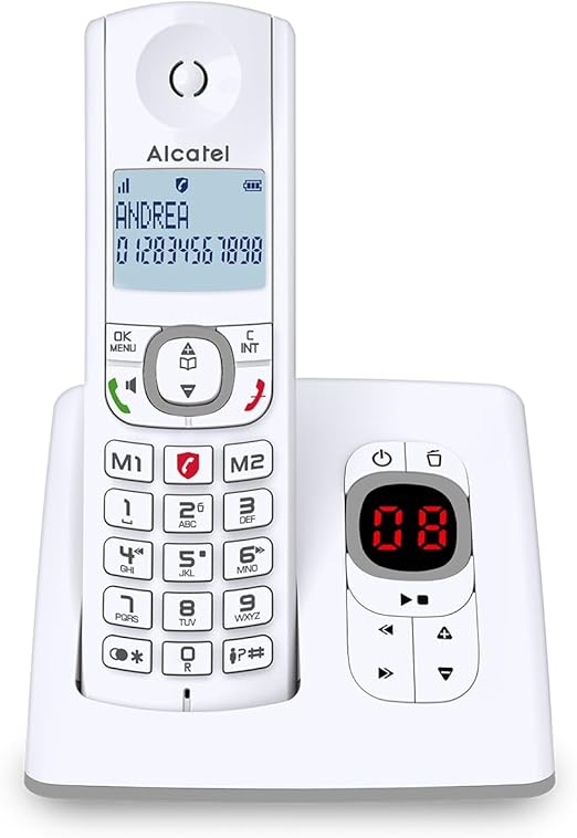 LPNHE925732760 – ALCATEL F530 Voice – Bezprzewodowy telefon stacjonarny DECT z automatyczną sekretarką – Duży podświetlany ekran – Głośnomówiący – Funkcja blokowania połączeń – 2 klawisze szybkiego wybierania – Biało-szary – A765
