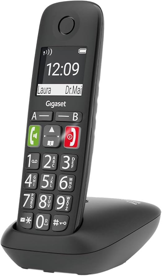 - LPNHK368057155 – Gigaset E290 – Bezprzewodowy telefon dla seniorów bez automatycznego odtwarzania wiadomości z dużymi klawiszami – Przyciski wybierania celu dla ważnych numerów, funkcja wzmacniacza dla dodatkowo głośnego słuchania, czarny [wersja niemiecka] – B254