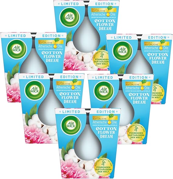 LPNHK371516391 – Air Wick Świeca zapachowa w szkle – zapach: Cotton Flower Dream – czas palenia do 20 godzin – zawiera naturalne olejki eteryczne – zestaw świec zapachowych 6 x 105 g – C301