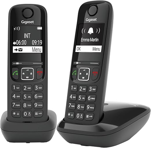 LPNHK378352307 – Gigaset AS690 Duo – 2 bezprzewodowe telefony DECT – kontrastowy wyświetlacz – doskonała jakość dźwięku – regulowane profile dźwięku – funkcja głośnomówiąca – ochrona przed połączeniami, czarny [wersja niemiecka] – B772