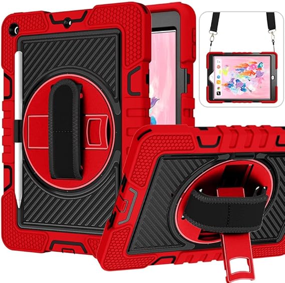 LPNRP037025225 – Etui na iPad 9.7 (2017/2018) Case Shockproof W pełni pokryte ciało z wbudowanym podpórką i 360° obrotowym paskiem na rękę i stojakiem paskiem do noszenia (czerwono-czarny) – B388
