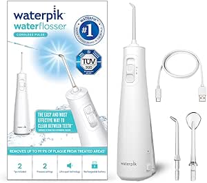 LPNRP064373466 – Waterpik Pulse Munddusche bezprzewodowa, profesjonalne usuwanie płyt bakteryjnych w 99,9%, 2 tryby intensywności, czyszczący przestrzenie międzyzębowe, pojemność zbiornika na wodę na 45 sekund, 2 końcówki w zestawie, kolor biały – K470
