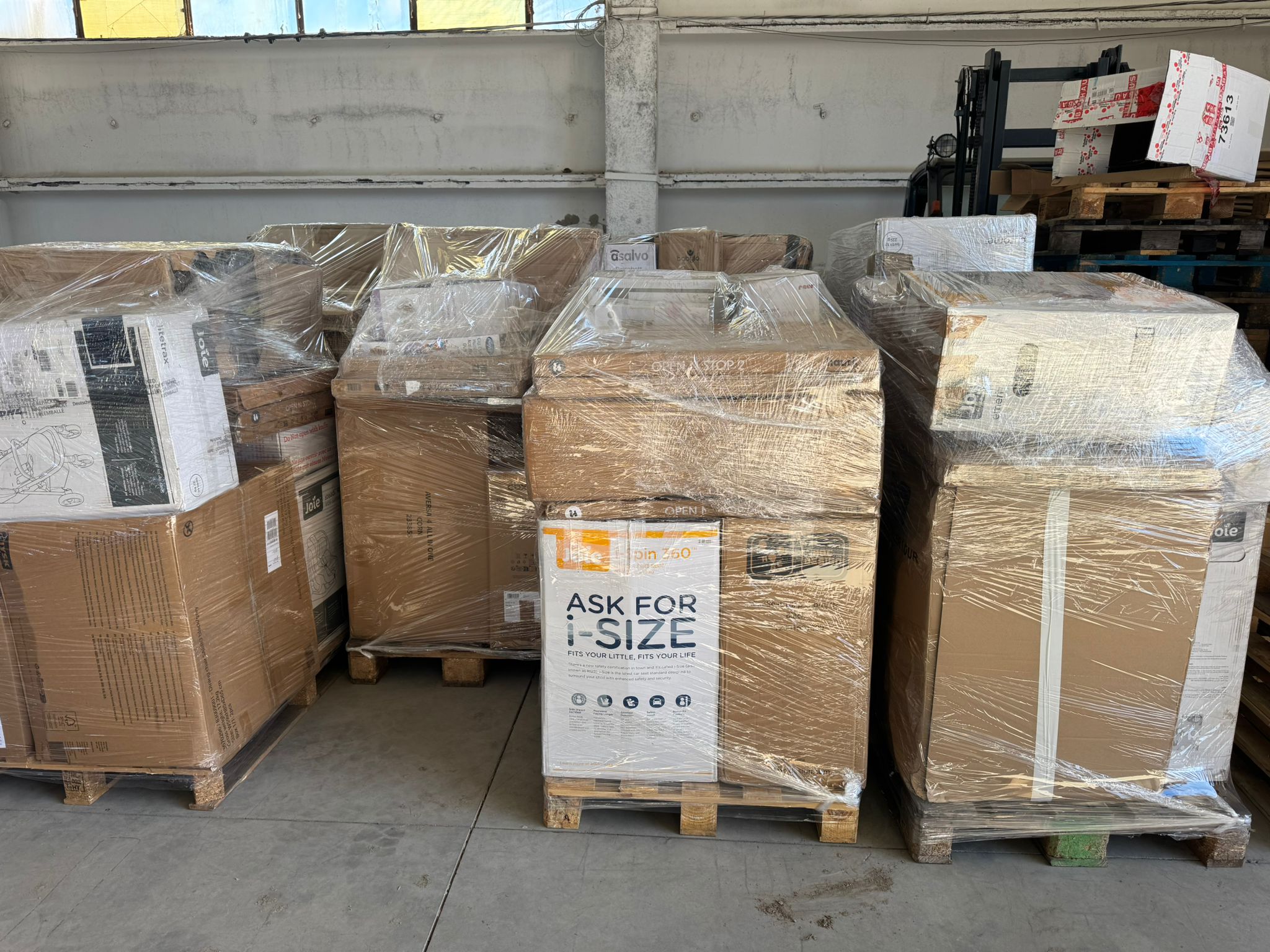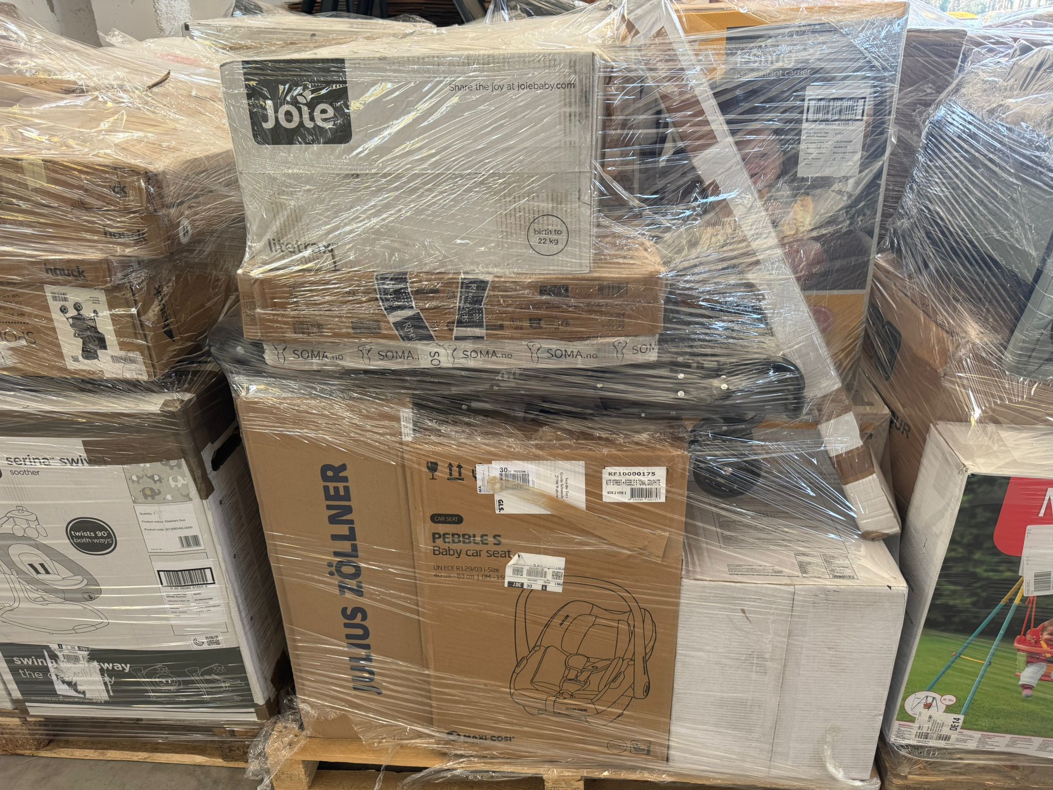 Na palecie znajdują się produkty dla dzieci typu foteliki wózki itp